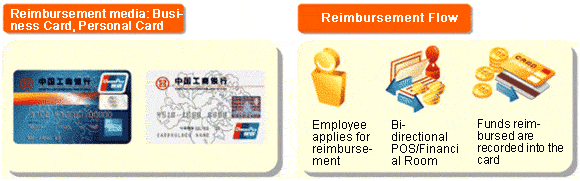 2. Financial Service The financial reimbursement plan proposed by ICBC is based on the consumption of business card or personal card, according to the plan, the reimbursement will be transferred into the business card or personal card of the person requiring reimbursement in terms of items or in batches through ICBC Corporate Account Room or special finance products like Bi-directional POS.