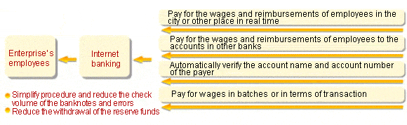 4. Payroll payment service and Internal Rendering Account Solution Through Internet Banking VIP room and financial POS, it can meet the demand on various payroll payment services and rendering account within the enterprise.