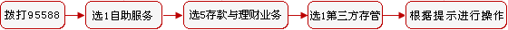 您通过网上银行、电话银行、手机银行可在周一至周五8:30-16:00之间办理第三方存管自助注册、转账和查询业务,具体时间以证券公司规定为准。(注:该功能仅限在部分券商使用) 操作指南